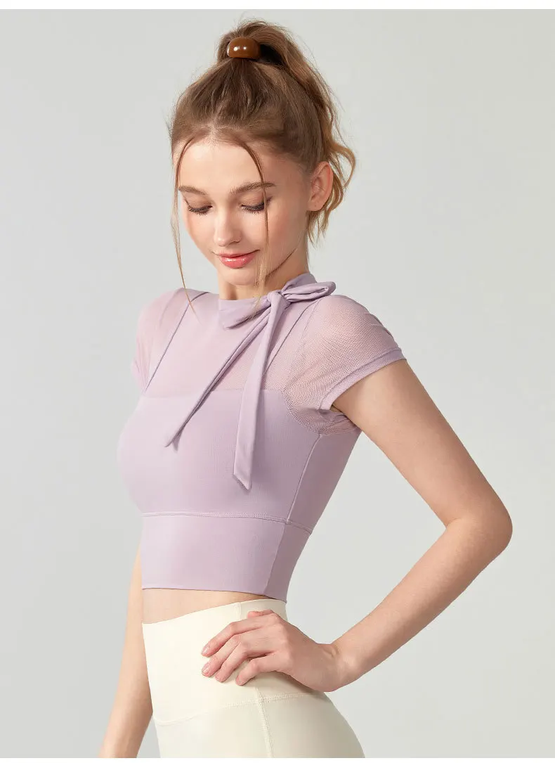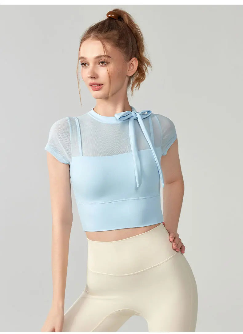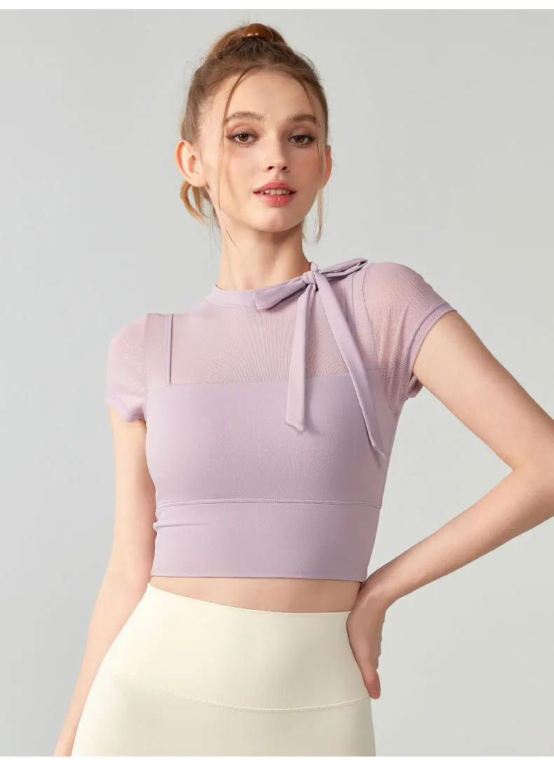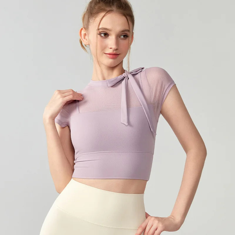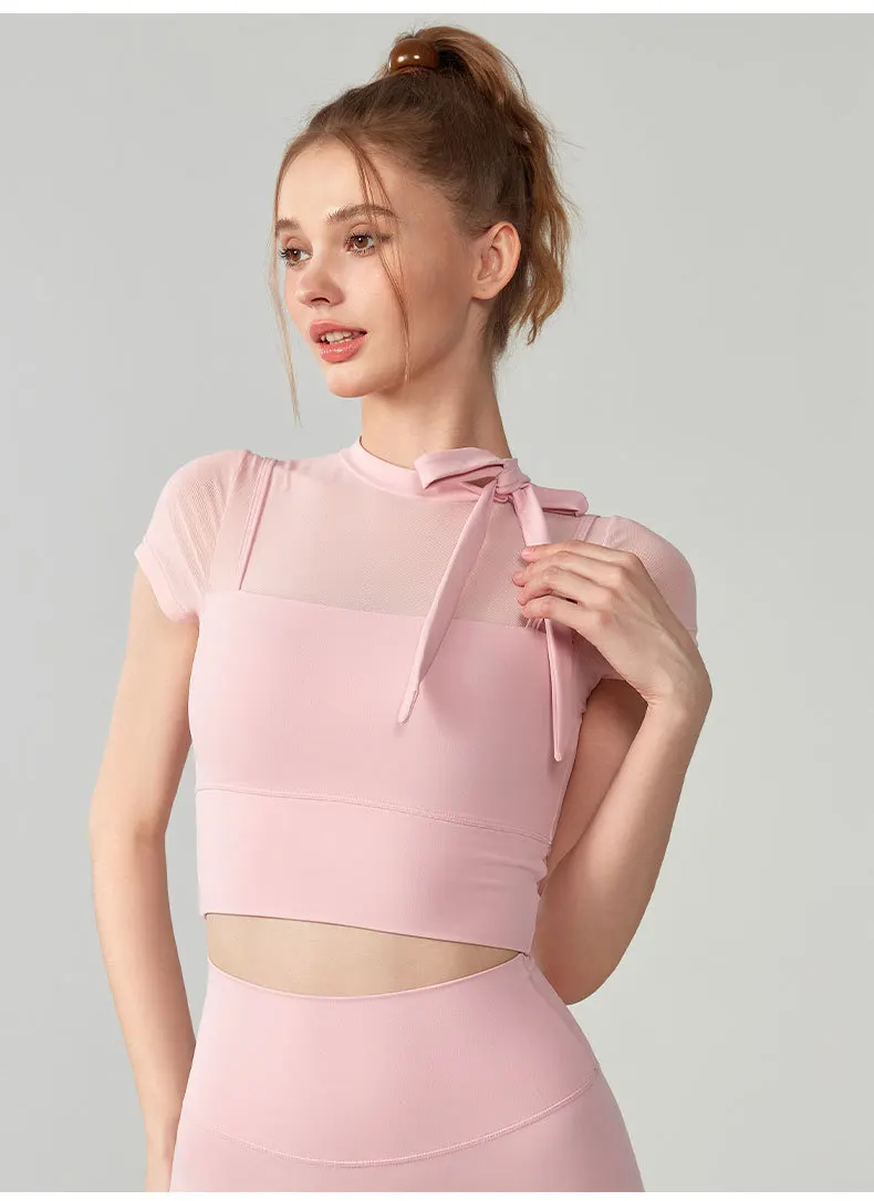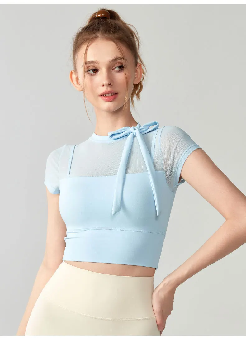 透け感のあるメッシュショルダーとサイドリボンのアクセントが印象的な、可憐さと機能性を兼ね備えたブラトップ。