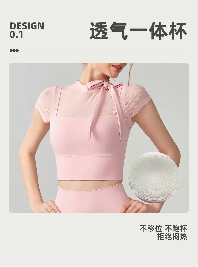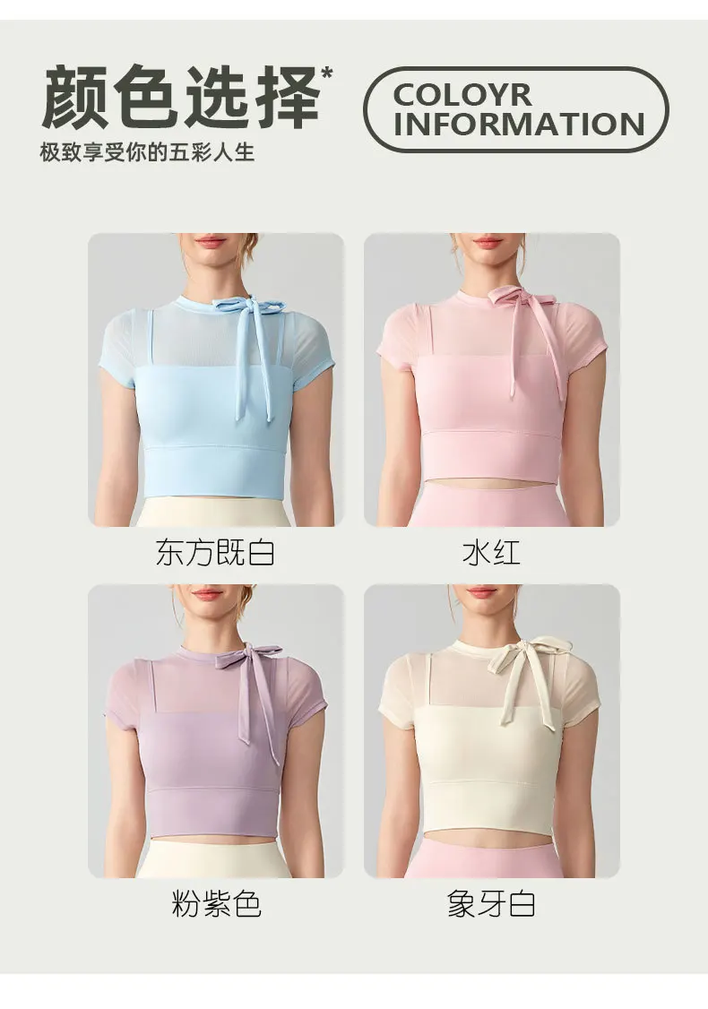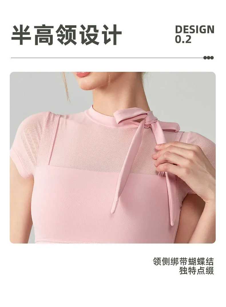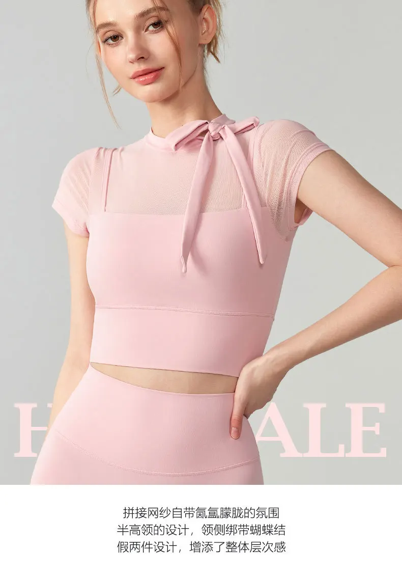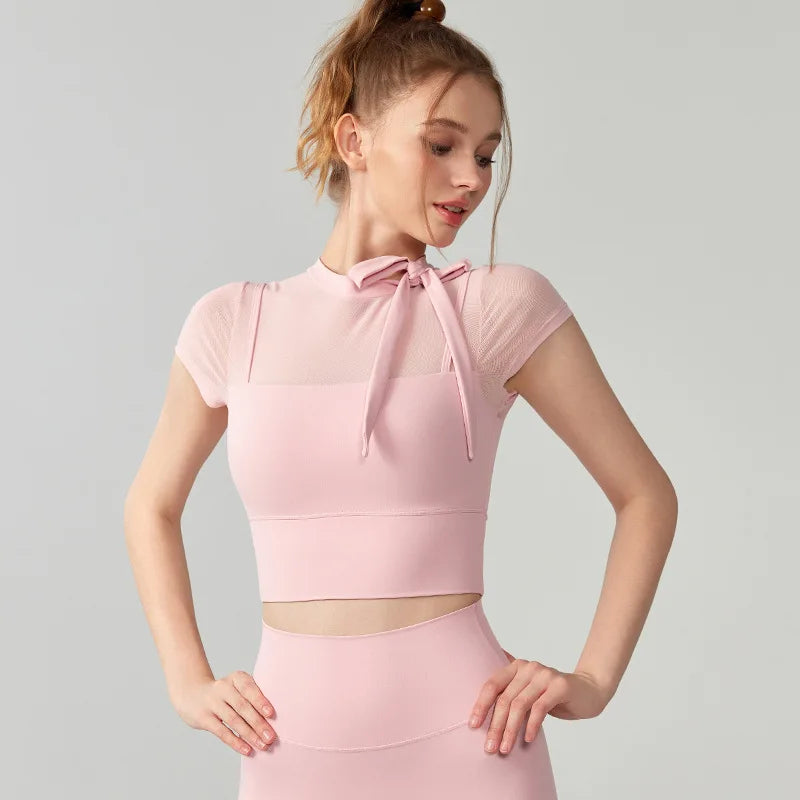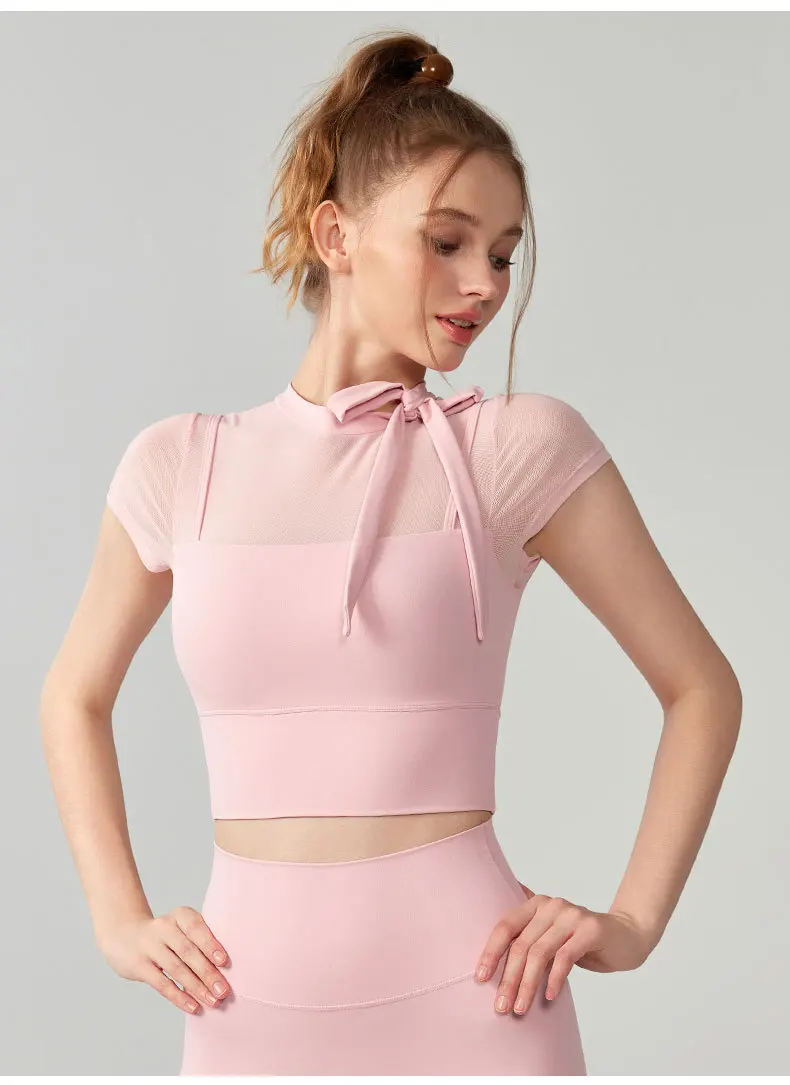 透け感のあるメッシュショルダーとサイドリボンのアクセントが印象的な、可憐さと機能性を兼ね備えたブラトップ。
