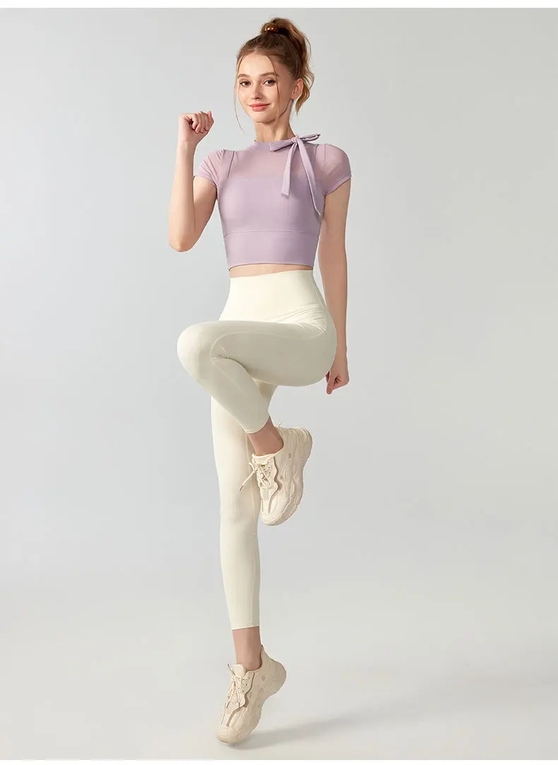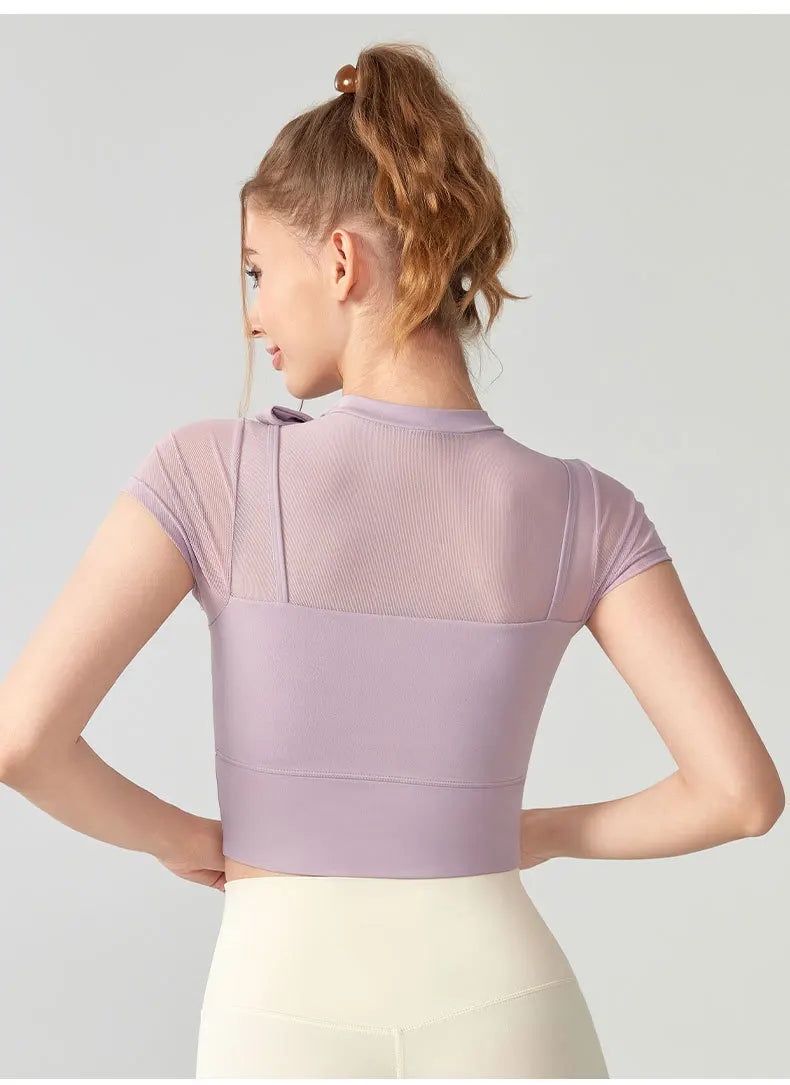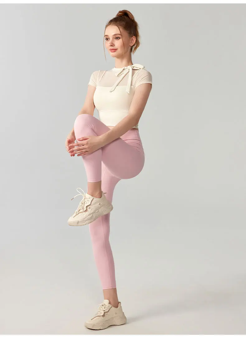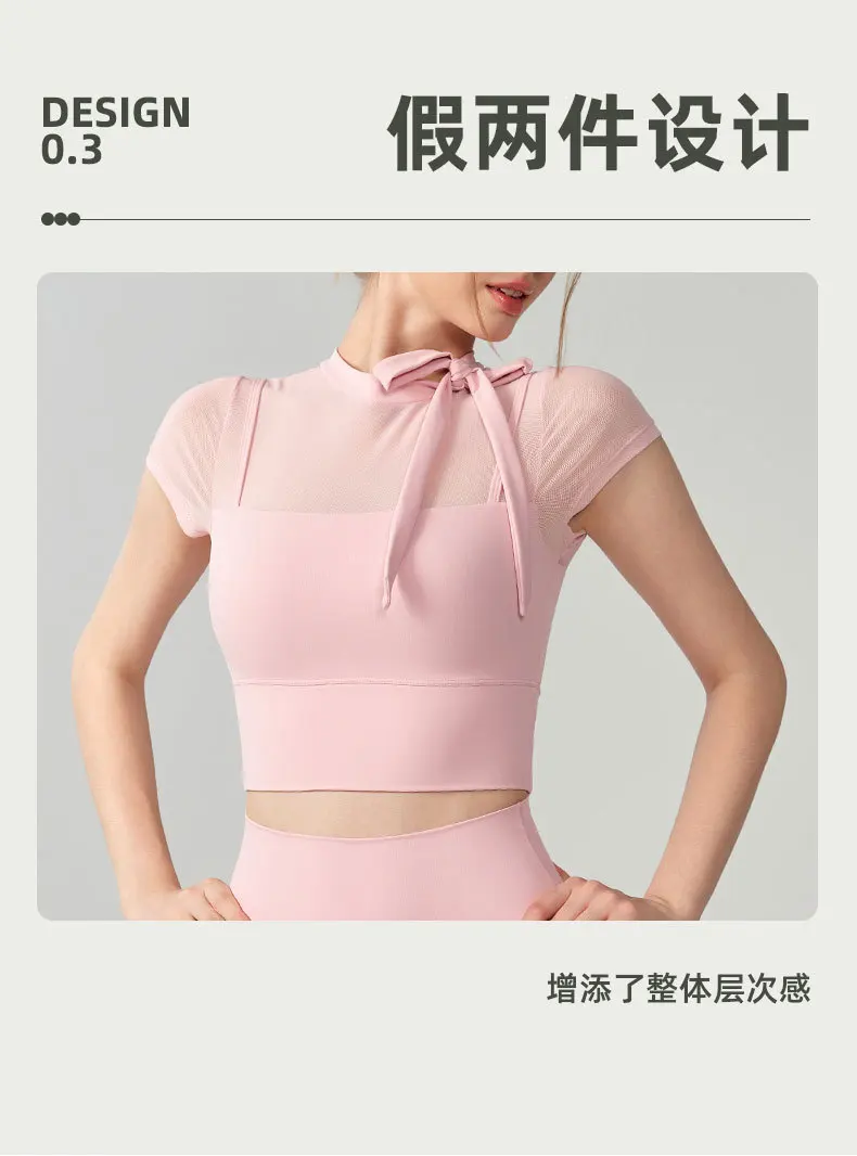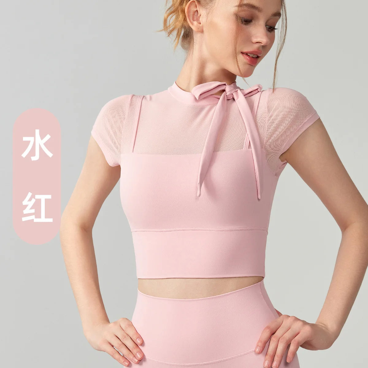 透け感のあるメッシュショルダーとサイドリボンのアクセントが印象的な、可憐さと機能性を兼ね備えたブラトップ。
