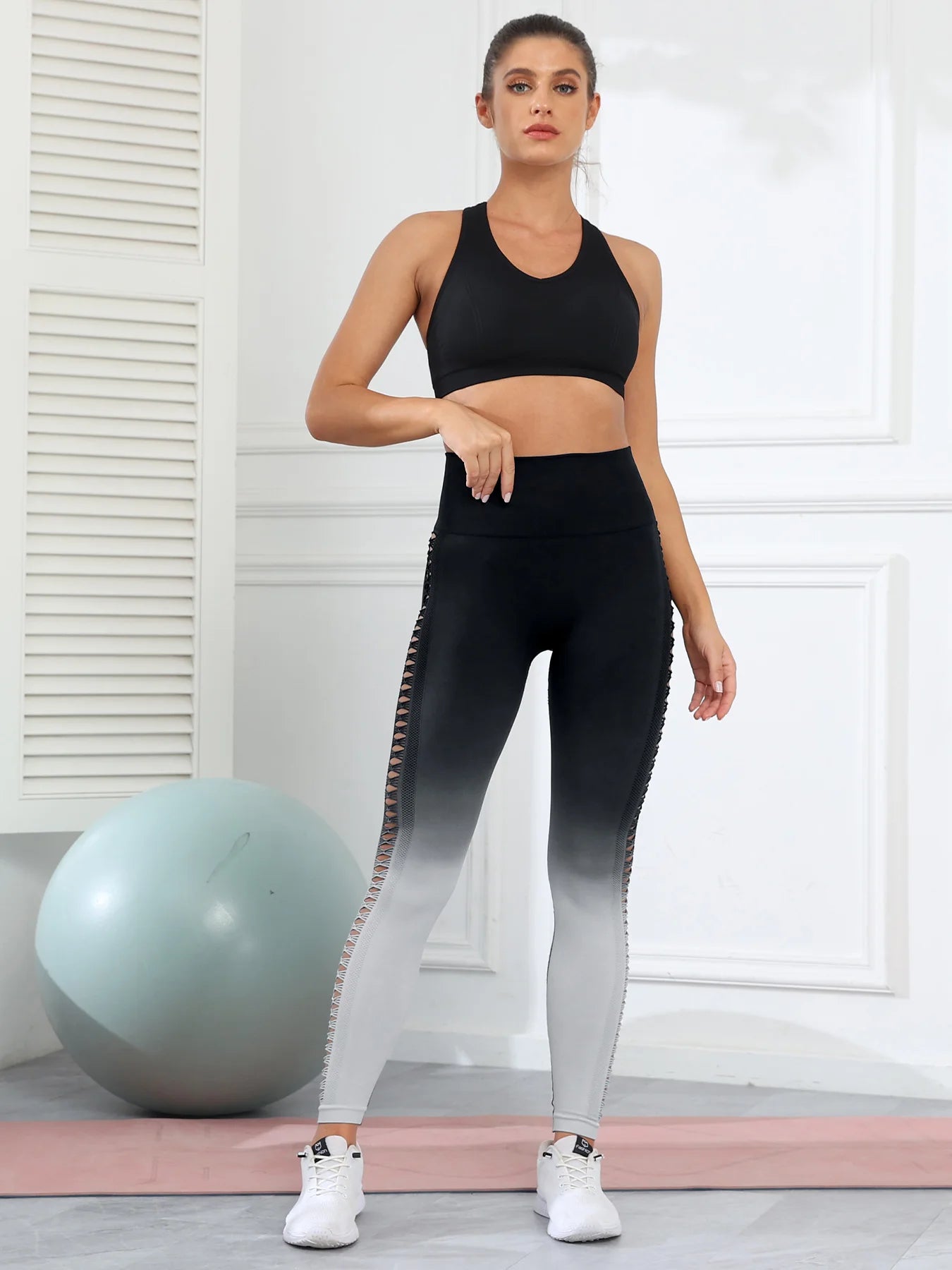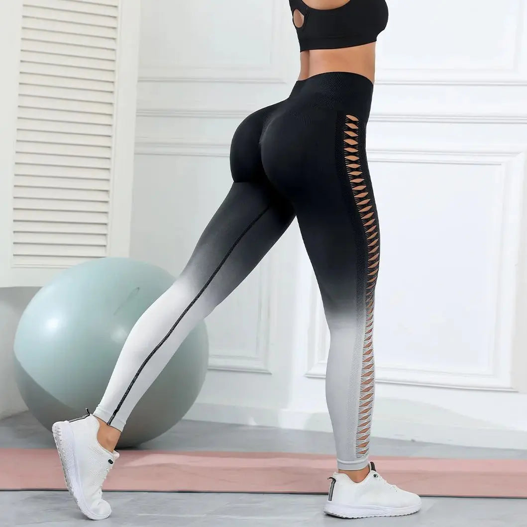 シャープなグラデーションカラーとサイドレースアップ風の抜け感が絶妙な、モード感漂うスタイルアップレギンス。